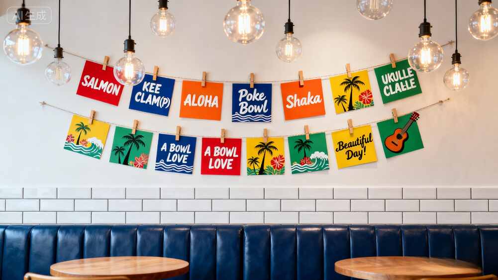 墻上那張海報才是靈魂所在!"Poke Makes My Day Everyday"這句話簡直寫到打工人心坎里了,配上誘人的波奇碗圖片,看著就讓人食欲大開。右上方那個復(fù)古燈泡更是點(diǎn)睛之筆,暖黃光線灑下來,連水泥墻都變得溫柔起來。