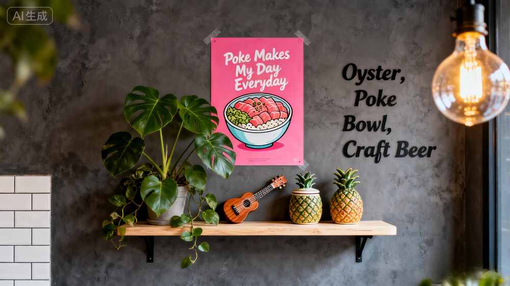 寶子們!今天挖到這家神仙餐廳——Poke-d,推門瞬間就被這個海底世界驚艷到了!整面墻的海洋壁畫太絕了,藍色背景上游動著各式魚兒,超大棕櫚葉圖案瞬間把你拉到夏威夷海邊,這氛圍感我給滿分!