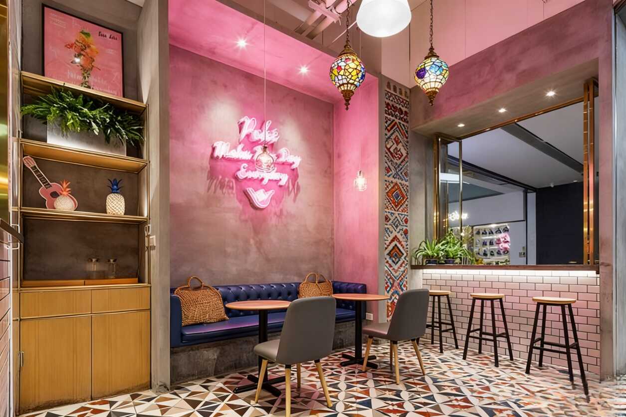 先看主角:白墻上掛著一排彩色卡片,用原木夾子固定,簡(jiǎn)單卻賊有巧思??ㄆ嫌≈癝ALMON”“ALOHA”這種俏皮英文,搭配棕櫚樹(shù)、小花朵圖案,瞬間帶出夏威夷般的輕松調(diào)調(diào)。往下瞄,白色瓷磚墻+深藍(lán)色皮質(zhì)卡座,再配個(gè)木質(zhì)圓桌,層次感立馬就出來(lái)了。***絕的是頭頂那兩盞透明球形吊燈,光線一打,溫馨指數(shù)飆升,拍照根本不用濾鏡!