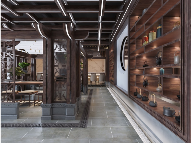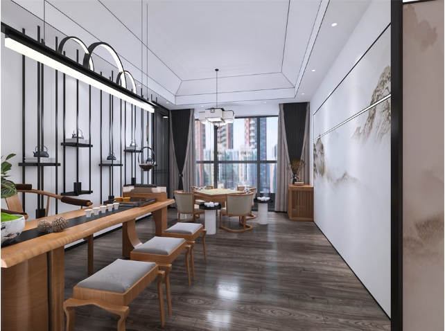 本案是一家中式禪意茶樓,整體風格利用棕色搭配白色色調(diào),來凸顯中式格調(diào),結(jié)合古典裝飾元素,來表現(xiàn)中國風。