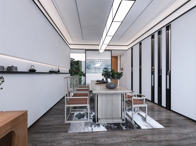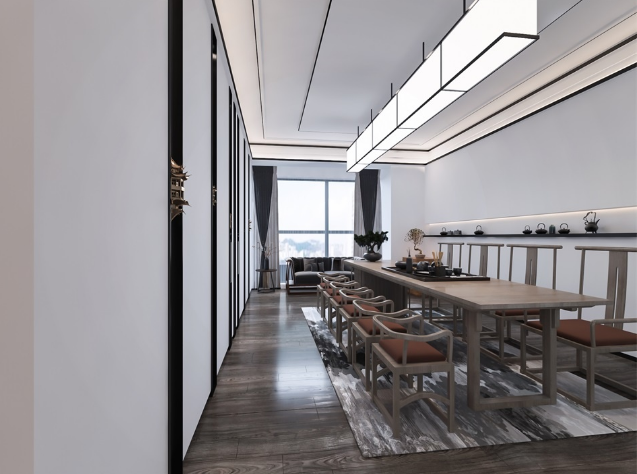 大面積落地玻璃將自然光引入室內(nèi),使得室內(nèi)寬敞明亮,使用局部燈光照明,視覺效果上增加了空間的層次感。干練的硬裝彰顯豪邁的氣派,白凈優(yōu)雅的軟裝則體現(xiàn)極簡的中國風茶室。