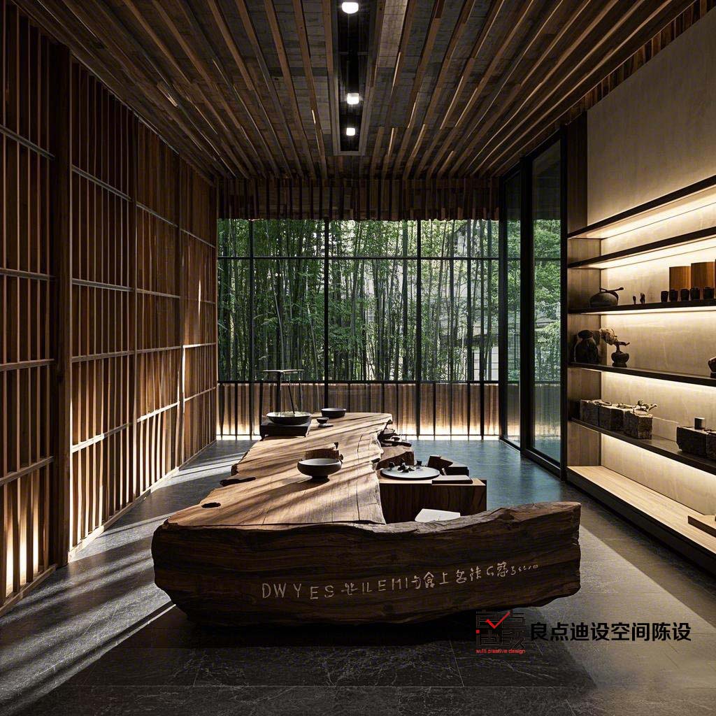圖1:陽(yáng)臺(tái)茶室軟裝效果圖1,使用了竹子、藤條等天然材料,營(yíng)造出自然的氛圍。