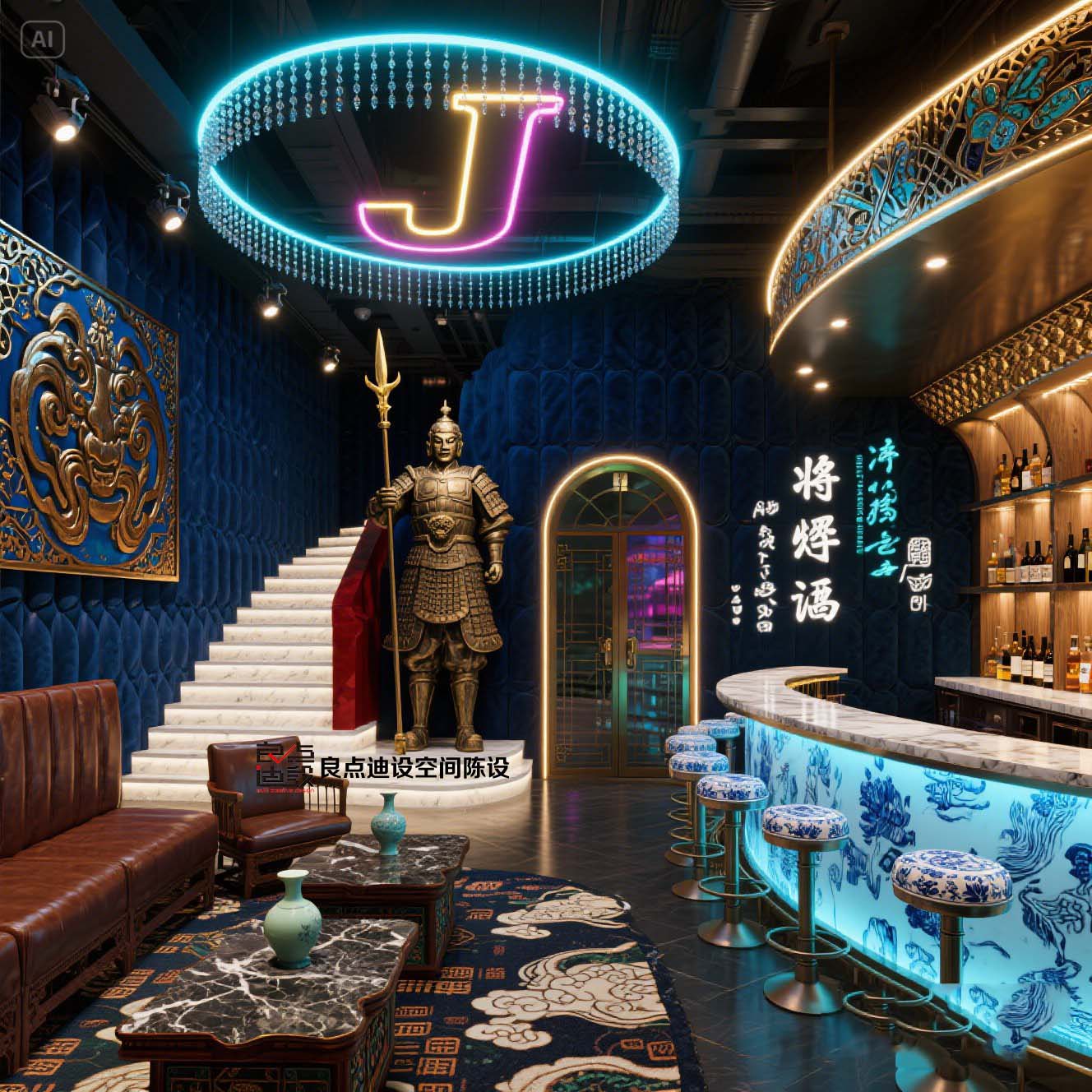 看這尊兩米高的青銅將軍雕塑???古代戰(zhàn)甲和現(xiàn)代射燈碰撞 吧臺小哥調(diào)酒都像在作法事(褒義)!背景墻必須吹爆 深藍(lán)底+24K金箔浮雕 隨手拍都是故宮聯(lián)名款既視感