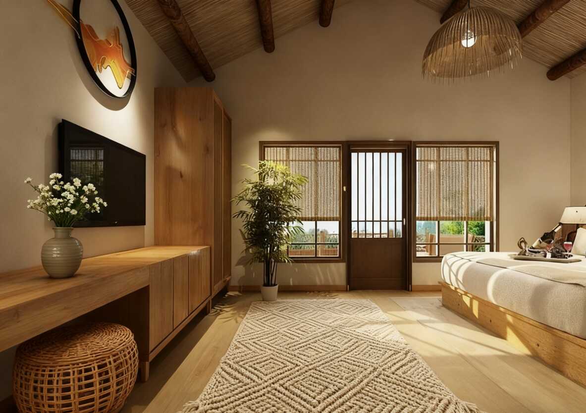 鄉(xiāng)村侘寂風民宿軟裝設計絕了!大窗 + 藤編 + 亮黃點綴,住進這里像把山野搬進了家