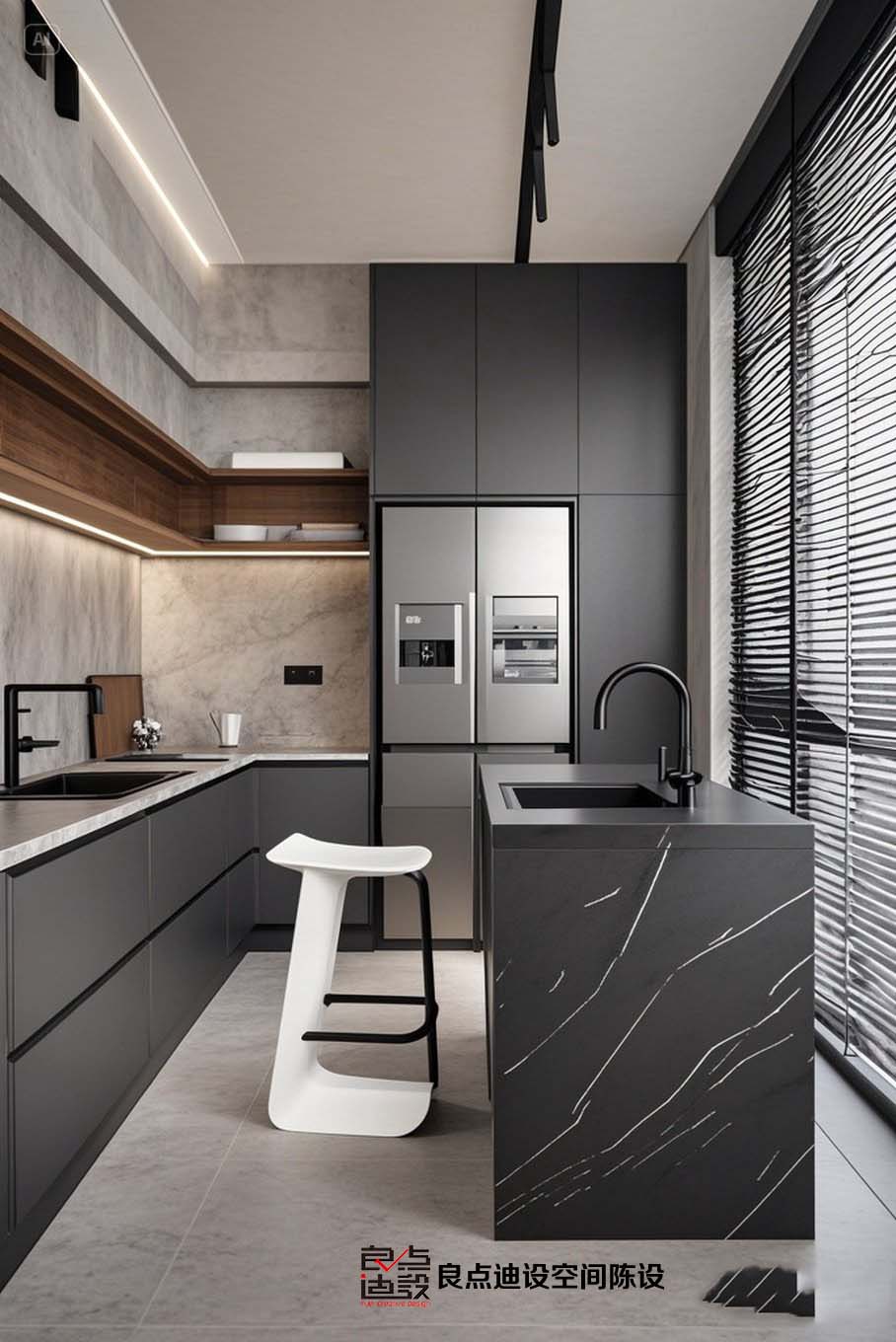 這是一張現代輕奢風格的廚房圖片,采用深灰色和白色的設計風格,讓整個廚房顯得更加高貴、奢華。同時,選用高品質的廚房家電和廚具,增加了廚房的實用性和品質感。