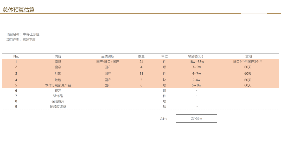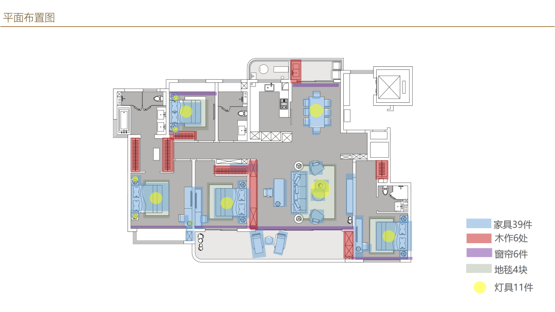 我們現(xiàn)在看到這張圖,是 軟裝產(chǎn)品數(shù)量分析圖,軟裝區(qū)別于硬裝的是,軟裝是需要有產(chǎn)品落地的,我們能看出來,家具大致需要39件,木作大致6處,窗簾大致需要6處,地毯大概需要4塊,燈具大致在11件。