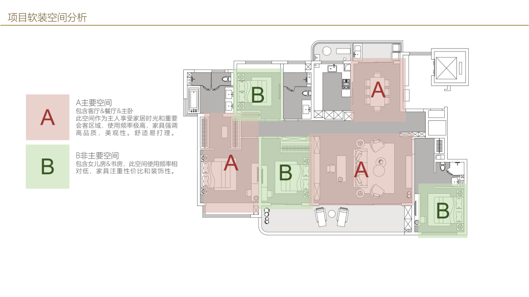 對于整體空間,一定要有主次之分(如上圖),整個空間一定以客餐廳和主臥作為整體空間的 主要空間,使用頻率相對更高,家具更強調(diào)品質(zhì)和美觀,同時具備舒適性,便于打理。