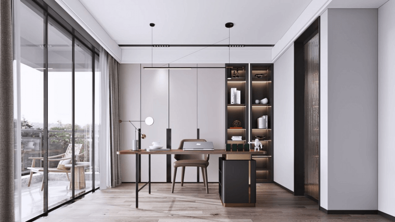 或者只作為獨(dú)立書房時(shí)需要規(guī)劃足夠的收納空間,靠墻定制書桌+書柜,可容納多人使用,便于工作學(xué)習(xí)。開放式與封閉式并存的書柜,既可以擺放書籍,也可以擺放裝飾品。