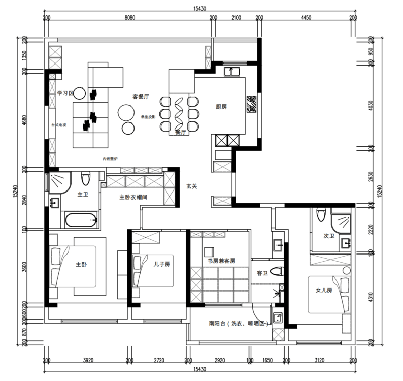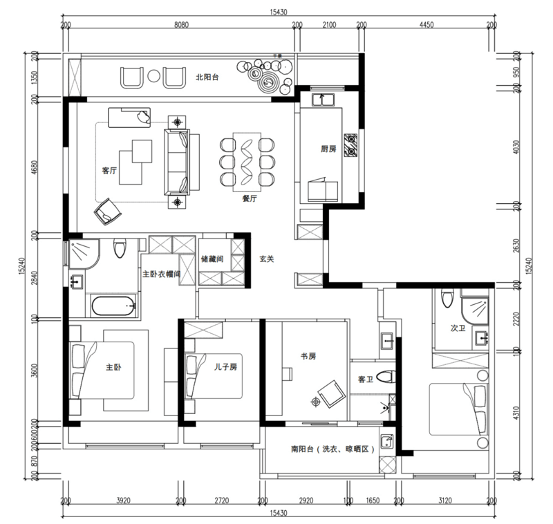 因?yàn)檫@個(gè)戶型南北都有陽(yáng)臺(tái)所以南陽(yáng)臺(tái)主要用作洗衣晾曬,北陽(yáng)臺(tái)作為休閑區(qū),種種鮮花綠植等。四個(gè)房間均朝南,保留其中三間臥室均帶有飄窗,居住起來比較舒適,兩間作臥室套房,一間為主臥,另一間可以作為長(zhǎng)輩房,使用起來更加方便;兒子房靠近書房,臥室比較小,只做基礎(chǔ)的收納和滿足睡眠需求,學(xué)習(xí)主要在書房完成,提高空間的使用頻率。